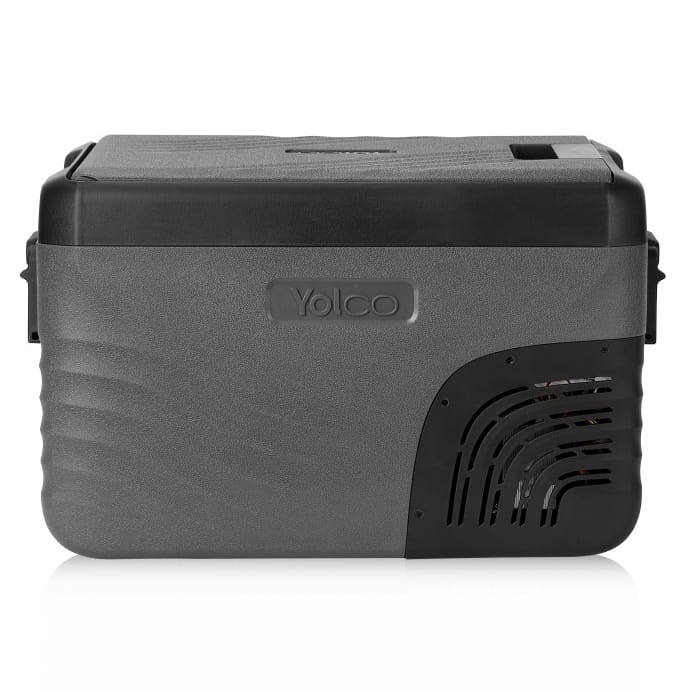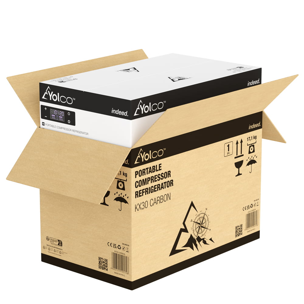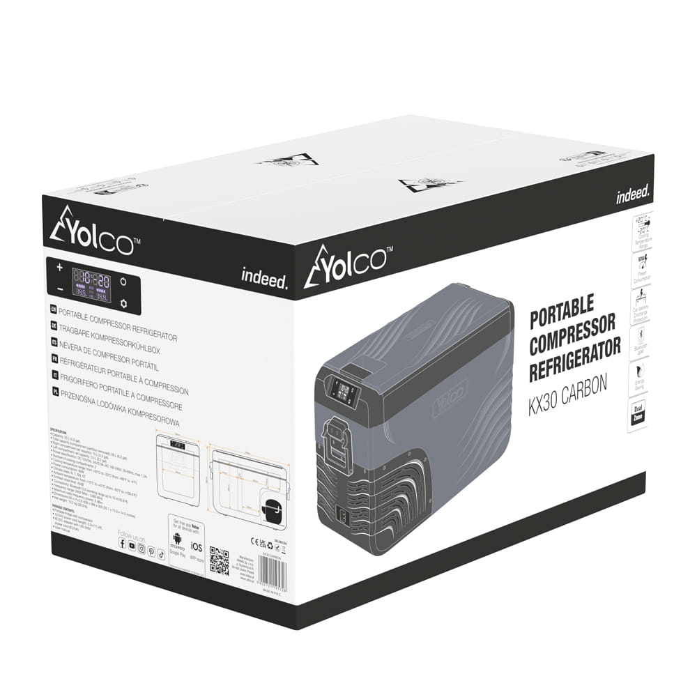 Przenośna lodówka kompresorowa Yolco KX30 CARBON, pojemność 25 L (28 L po wyjęciu przegrody). Chłodzenie i mrożenie od +20°C do -20°C. Zasilanie: 12/24 V DC, 100–240 V AC, opcjonalne baterie i panele solarne. Kompaktowa, energooszczędna, idealna do samochodu, kampera i na camping.
