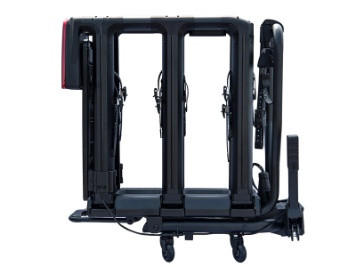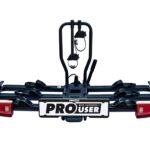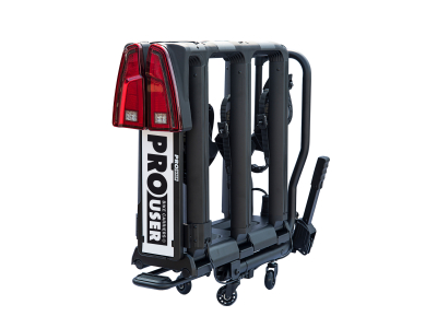 Profesjonalny bagażnik rowerowy na hak – PROUSER Diamant FG3 Black z dynamicznym oświetleniem LED. Mieści do 3 rowerów (lub 4 z adapterem), kompatybilny z e-bike’ami, składany i uchylny. W zestawie kółka transportowe i pokrowiec.